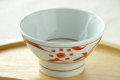 ![]() ひとふでひとふで熟練の筆のはこび。赤い絵付けの太陽柄は明るく元気なイメージ。 ![]() 茶碗のまわりにバランスよく配置された絵柄。 |