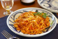 砥部焼・梅山窯 からくさもようの大皿(7寸)にナポリタンを盛って
