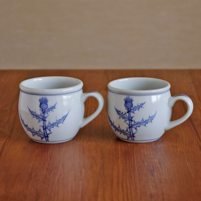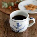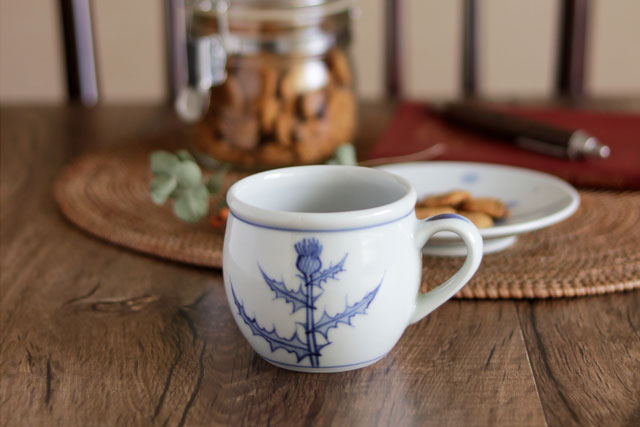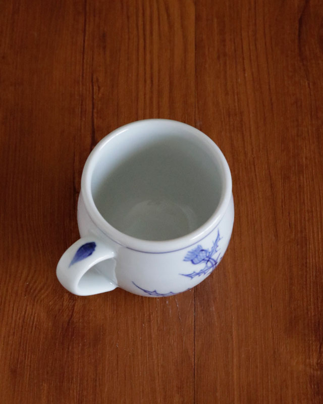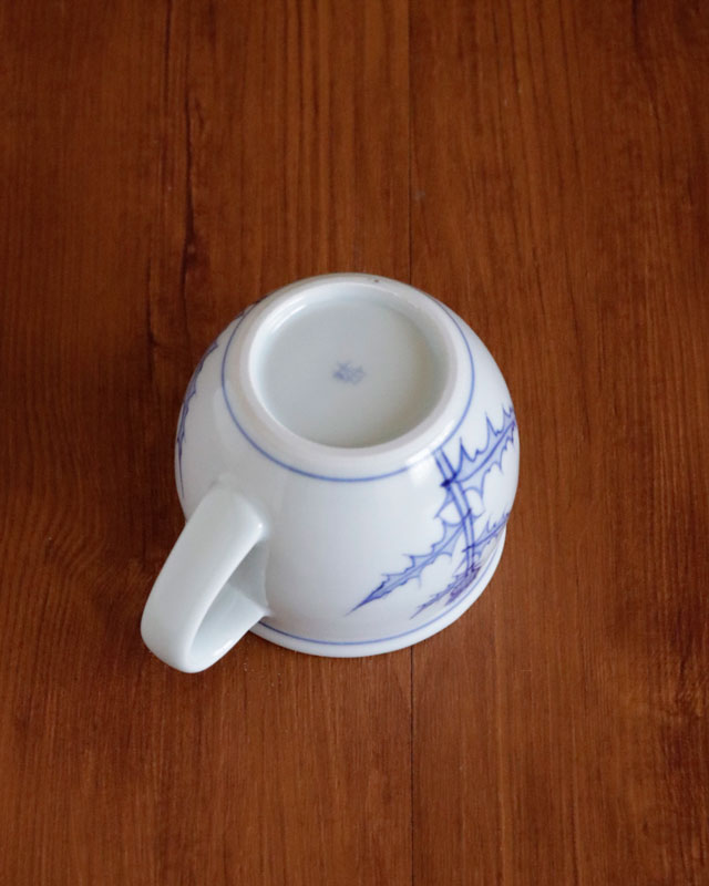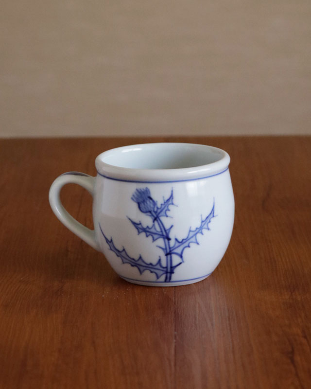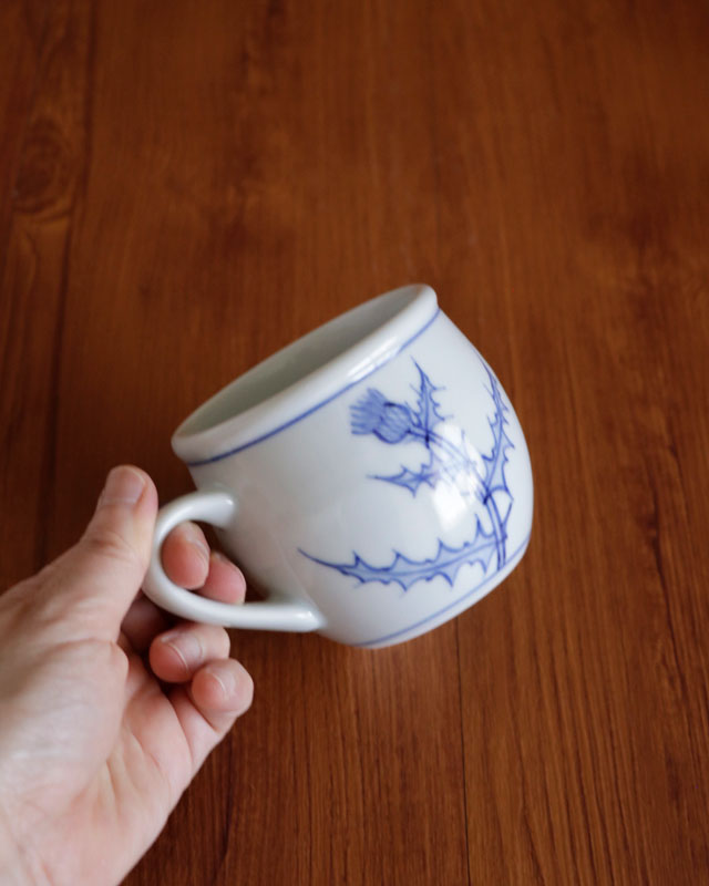 ![]() ふっくらと丸みある形が特徴のマグカップ。大きめではありませんが、ふくらみある形なので見ためよりも飲み物が入ります。 ![]() ![]() 手描きらしさを活かしたアザミの染付が素敵です。 ![]() アザミは2ヶ所に描かれています。 ![]() 持ちやすいように作られた、幅1.5cmくらいの板状の持ち手。 ![]() 底の直径は5.5cmくらいです。 |