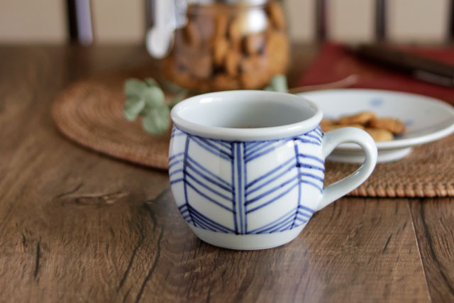 ![]() ふっくらと丸みある形が特徴のマグカップ。大きめではありませんが、ふくらみある形なので見ためよりも飲み物が入ります。 ![]() ![]() 日本の伝統的な文様「矢羽根」。幾何学的な文様でありながら手描きらしい味わいがあります。 ![]() 美しい文様がカップを囲むように描かれています。 ![]() 持ちやすいように作られた、幅1.5cmくらいの板状の持ち手。 ![]() 底の直径は5.5cmくらいです。 |