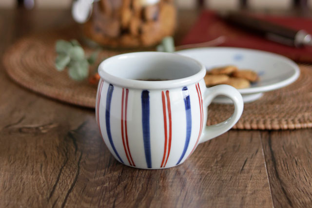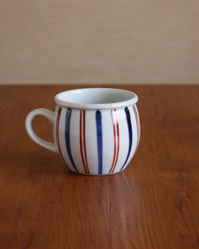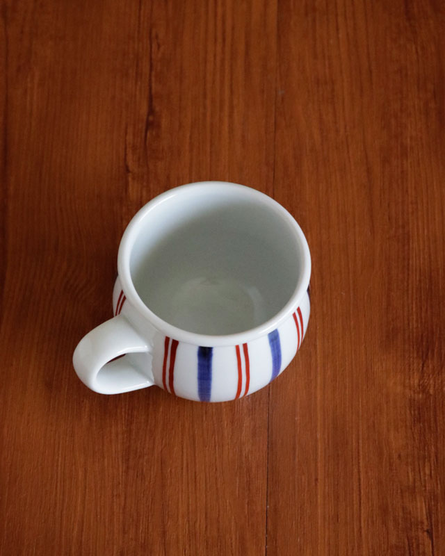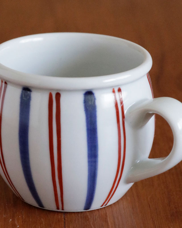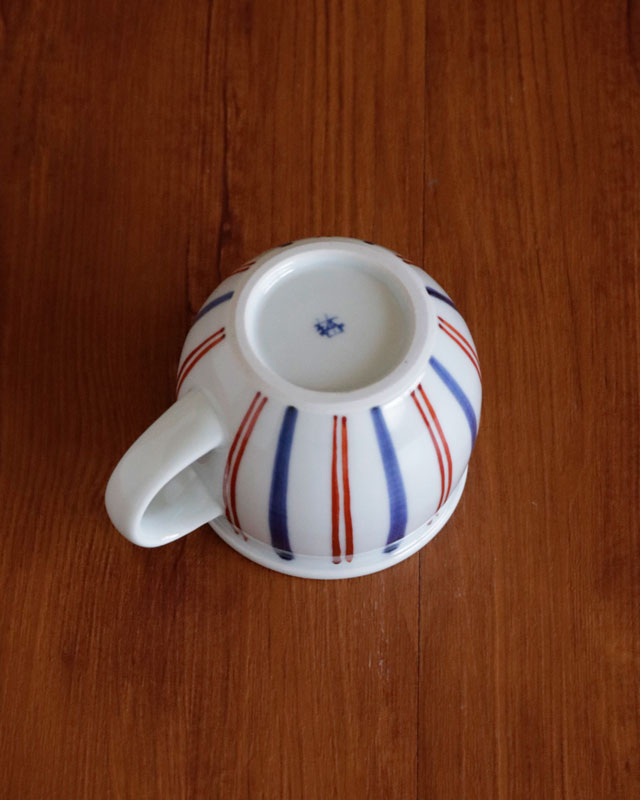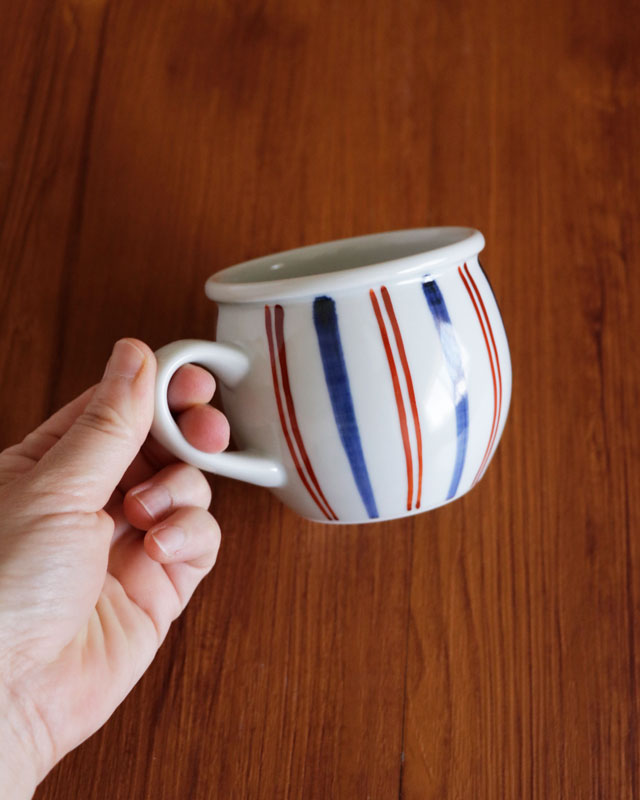 ![]() ふっくらと丸みある形が特徴のマグカップ。大きめではありませんが、ふくらみある形なので見ためよりも飲み物が入ります。 ![]() なめらかな白磁に引き立つ藍と赤のコントラストがきれい。シンプルでありながらも手描きらしい味わいがあります。 ![]() 藍と赤のラインがカップを囲むように描かれています。 ![]() 持ちやすいように作られた、幅1.5cmくらいの板状の持ち手。 ![]() 底の直径は5.5cmくらいです。 |