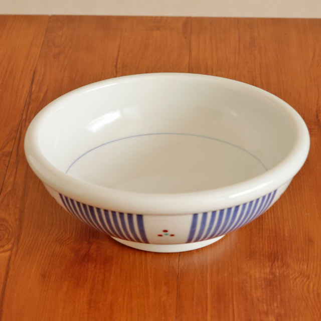 ![]() 玉縁と呼ばれる丸みある縁が特徴の直径22cmの深みあるうつわ。 ![]() 高さは8cmくらい。藍のラインの中で引き立つ赤い三つの文様。ほっこりとし雰囲気もある絵付けです。 ![]() うつわの内側は藍のラインが引いてあるのみですので、砥部焼らしいなめらかな白磁がより引き立ちます。 ![]() 高台の直径は10.5cmくらい。 ![]() ぽってりと丸みあるかたち。 ひとつひとつ描き方や藍色の濃さなど手仕事らしい違いがあります。 ![]() これくらいの大きさ。砥部焼らしく厚手ですので、ある程度の重みがあります。 |
