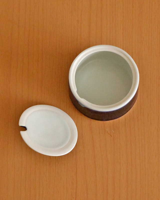 ![]() 直径7cm×高さ5.5cmくらいの可愛らしく便利な蓋物。 ![]() 本体の入れ物の高さは3.5cmくらい。 ![]() 蓋には薬味スプーンを入れることができる窪みが入っています。 ![]() 本体にもスプーンを入れるための窪みがあります。 ![]() 裏には梅山窯さんの「梅」の窯印。 ![]() 使いやすいほどよい深みです。 竹製の薬味スプーン(440円)付きも販売いたしております。 「薬味スプーン」をご希望の際はご注文の際に『備考欄』にてお申しつけください。 |