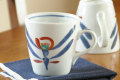 梅山窯さんにはこんな形のマグもあったんです。持ち手が細くてちょっと大人っぽい印象です。緑の絵付けが効いています。
