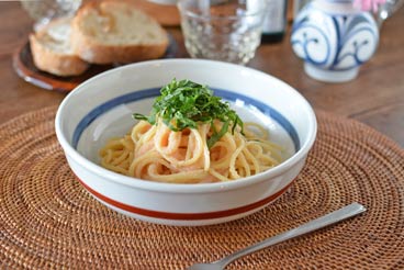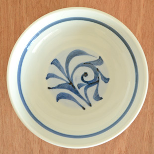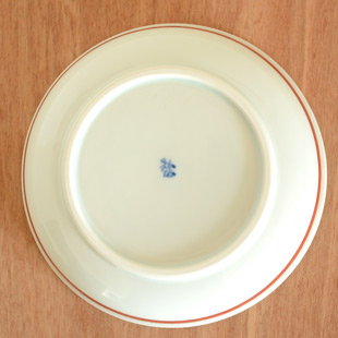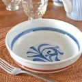 料理をいただくと唐草の文様が現れるところがなんともお洒落。縁の近くに引かれた8mm幅の藍色の線が絵付けを引き締めています。