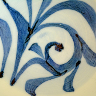 淡い藍色に濃い藍色で表現された唐草の絵付けは上品な奥深さがあります。手描きらしいあたたかみある絵付けです。