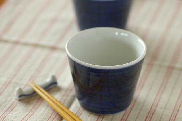 砥部焼・梅山窯 藍色のそばちょこを横から見て