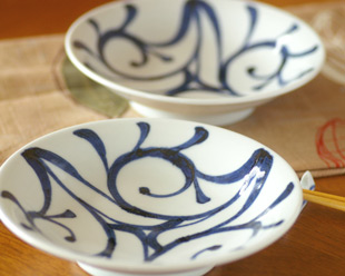 みつからくさの反深皿 料理が引き立つ唐草模様。 梅山窯 ばいざんがま |
