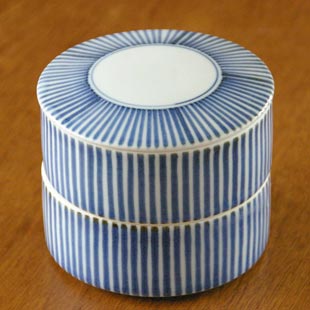 砥部焼・梅山窯 からくさの二段ふた物を横から見て