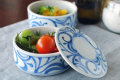 砥部焼・梅山窯 からくさの二段ふた物に野菜を