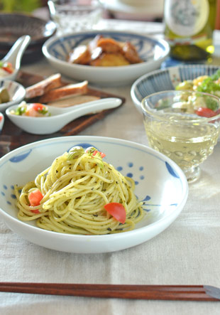 お料理を盛り付けると、やさしいかんじの太陽柄が少し見えるのもまた素敵です。