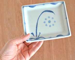 太陽柄の布目角皿 やさしい素朴さが魅力の絵付け。 梅山窯 ばいざんがま |