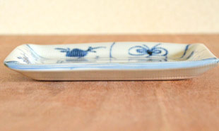 高さは1.3cmくらい。ゆるやかに少しフチが立ち上がっていますので、少々汁気のあるお料理にもお使いいただけます。フチの部分の淡い藍色の染付もお洒落。