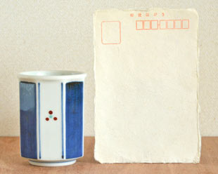 ![]() 毎日のお湯呑みにぴったりの持ちやすい形。 ![]() 白磁に映える藍色の太めのライン。赤いみつ紋が素朴なかわいらしさ。 ![]() 高さは8.5cmくらい。 ![]() ふちの部分は小さな玉ブチになっているのも特徴。口当たりなめらかです。 ![]() お湯呑は八角形ですが、飲み口は円形になっています。直径は6.5cmくらいです。 ![]() 底には梅山窯さんの『梅』の窯印。 ![]() はがきと比べて。 |
