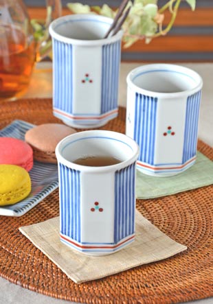 ![]() なめらかな白磁だから緑茶がきれいに引き立ちます。 ![]() フリーカップとして、紅茶やコーヒーなどをいただいても♪ ![]() 赤い絵付けのなかに、わずかに入った緑が差し色となりお茶碗を彩ります。 ![]() 手づくりですので、お湯呑ひとつひとつ絵付けの濃さなどに微妙な違いがあります。 ![]() ひとまわり小さめの「とくさみつ紋の八角湯呑(小)」(右)もあります。ペアでのギフトにもおすすめです。 ![]() 持ちやすく、おさまりのいい形です。厚手なので丈夫です。 |