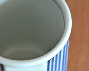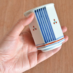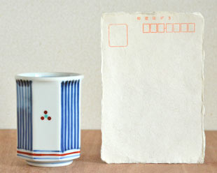 ![]() 毎日のお湯呑みにぴったりの持ちやすい形。 ![]() 白磁に映える手描きの味わいある藍色のライン。赤いみつ紋が素朴なかわいらしさ。 ![]() 高さは8.5cmくらい。 ![]() ふちの部分は小さな玉ブチになっているのも特徴。口当たりなめらかです。 ![]() お湯呑は八角形ですが、飲み口は円形になっています。直径は6.5cmくらいです。 ![]() 底には梅山窯さんの『梅』の窯印。 ![]() はがきと比べて。 |