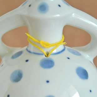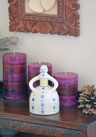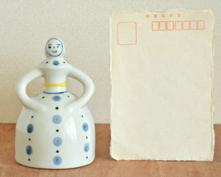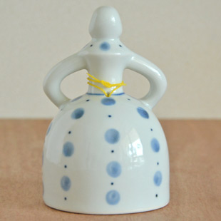 ![]() ![]() 人形のかたちの陶器の呼び鈴。人形を振ると陶器らしい心地よい音色が響きます。 ![]() 爽やかな印象の大小の水玉もようがスカートを彩ります。 ![]() 後ろ姿もかわいらしい。 ![]() 上から見たところ。頭には頭巾をかぶっています。 ![]() 黄色の紐でつながれた陶器の振り子。きれいな円形ではなく、手づくりらしい歪みある円です。 ![]() 振り子を結ぶ黄色い紐が衣裳のアクセントにもなっています。 ![]() はがきと比べて。 |