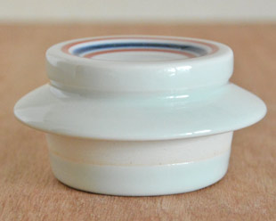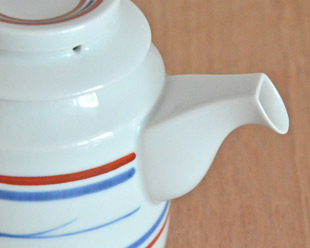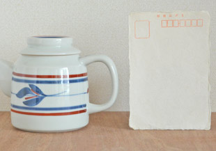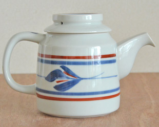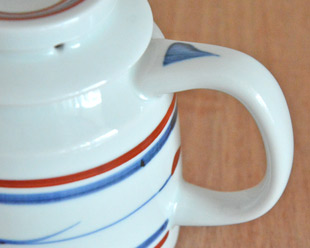 ![]() 円柱形の本体の上にのった帽子のような蓋が特徴のかわいらしいティーポット。「緑茶」でしたら2~3人分くらい、「紅茶」でしたら2人分くらいの大きさです。 急須らしくないデザインですので、注ぎ口が付いた蓋付の道具として、麺類のつゆ入れとしたり、すきやきの割り下を入れても。 ![]() 藍色と赤ラインがなめらかな白磁によく映えます。 ![]() 使いやすさだけでなく、ポットのデザインを考えてバランスよく付けられた注ぎ口。 ![]() 持ち手の幅は1.5cm前後くらいです。 ![]() 上から見たところ。蓋には赤いラインが引かれています。 ![]() ティーポット本体の底面と蓋の裏側。 ![]() 底には梅山窯さんの「梅」の窯印。 ![]() しっかり握ることができて持ちやすい形です。 ![]() はがきと比べて。 |