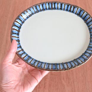 縞もようの布目小判皿 縁を彩る額縁のような絵付けが 梅山窯 ばいざんがま |
