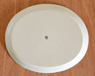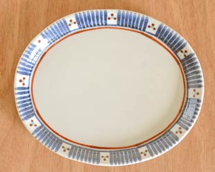 ![]() 21cm×17cmの楕円型のプレート皿。 小さめのワンプレート皿として、またしょうが焼やとんかつなど・・ひとり盛りの料理を少なめに盛りたい時にも活躍します♪ ![]() 高さは1.3cmくらい。平らな部分が広めのお皿です。フチ部分が立ち上がっていますので、少々汁気のあるお料理にもお使いいただけます。 何種類もの料理を一度に盛ることもできます。 ![]() きちんとした形の楕円皿ではなく、手づくりらしい歪みある形です。平らな部分は17.5cm×13.5cmくらい。 お皿を囲むように描かれた、淡い藍色の染付と茶色のバランスが素敵な絵付け。茶色のラインがが器を引き締めています。 ![]() 裏側の底は10cm×8cmくらい。釉薬(ゆうやく)が掛かっていないマットな底面です。梅山窯さんの「梅」の窯印。 ![]() 素地が柔らかいうちに布地をあてて表面を布目状にしていますが、釉薬が掛かったているので光沢があります。 布目に染みた淡い藍色の染付が雰囲気ある味わい。少し入った緑が差し色となっています。 ![]() 手づくりですので、ひとつひとつ形がまったく同じではありません。筆使いや藍色の濃さなどに手描きらしい違いがあります。 手作りのため、完全にフラットにすることはとても難しく、テーブルに置いたとき指で押さえると少々カタカタとなる場合もございますことご了承ください。 |