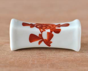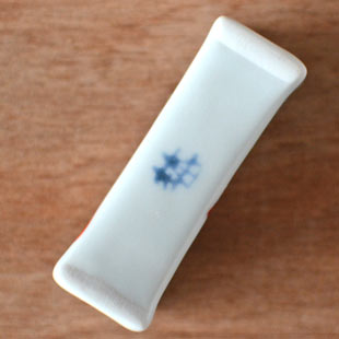 ![]() 梅山窯さんの定番の箸置き。枕の形に似ていることから枕型箸置きと呼ばれています。 ![]() 両端がゆるやかに反っていて、お箸を置きやすい形となっています。とても安定感のある箸置きです。 ![]() 横から見たところ。お箸を置く部分は高さ1.5cmくらい。お箸の上げ下ろしがしやすい高さです。 ![]() 赤の上絵付けが、なめらかな白磁によく映えます。手描きらしい柔らかなタッチ。 ![]() 裏には梅山窯さんの「梅」の窯印。両端の部分に少し高さがあり、釉薬(ゆうやく)が掛かっていませんので滑りにくくなっています。 ![]() これくらいの大きさです。 |