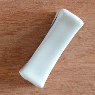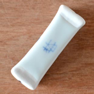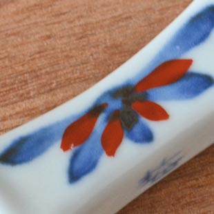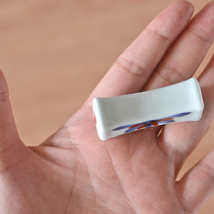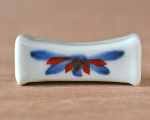 ![]() 梅山窯さんの定番の箸置き。枕の形に似ていることから枕型箸置きと呼ばれています。 ![]() 両端がゆるやかに反っていて、お箸を置きやすい形となっています。とても安定感のある箸置きです。 ![]() 横から見たところ。お箸を置く部分は高さ1.5cmくらい。お箸の上げ下ろしがしやすい高さです。 ![]() 藍色の染付と赤の上絵付けが、なめらかな白磁によく映えます。手描きらしい伸びやかなタッチ。 ![]() 裏には梅山窯さんの「梅」の窯印。両端の部分に少し高さがあり、釉薬(ゆうやく)が掛かっていませんので滑りにくくなっています。 ![]() これくらいの大きさです。 |