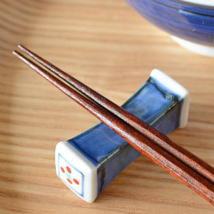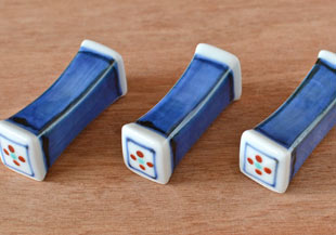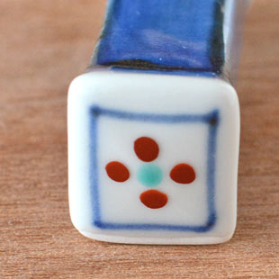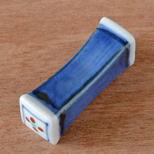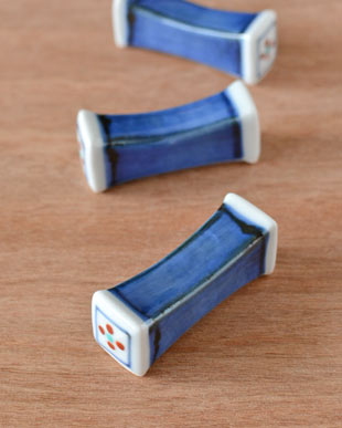 藍色がきれいで赤と緑の紋様が可愛らしい箸置きです。他の藍色の器を使う時に使うとお揃いみたいできれいです。