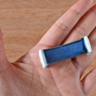 ![]() 梅山窯さんの定番の箸置き。枕の形に似ていることから枕型箸置きと呼ばれています。 ![]() 両端がゆるやかに反っていて、お箸を置きやすい形となっています。とても安定感のある箸置きです。 ![]() 横から見たところ。お箸を置く部分は高さ1.5cmくらい。お箸の上げ下ろしがしやすい高さです。 ![]() 手仕事の味わいを感じつ濃淡ある藍色。砥部焼らしい深みを感じます。 ![]() 裏には梅山窯さんの「梅」の窯印。両端の部分に少し高さがあり、釉薬(ゆうやく)が掛かっていませんので滑りにくくなっています。 ![]() これくらいの大きさです。 |
