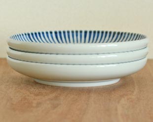 ![]() 直径18.5cmくらいの程よい深みあるかたちの中皿。 ![]() 高さは3cmほど。縁が立ち上がった形が特徴。汁気のあるお料理にもお使いいただけます。 ![]() お皿の中心の比較的平らな部分の直径は13cmくらいです。シンプルななかにも手描きらしいあたたかみが魅力です。 ![]() 高台の直径は11cmくらい。高台の周りには藍色のラインが引かれています。 裏には梅山窯さんの「梅」の窯印。 ![]() 3枚重ねると高さ5.5cmくらいの高さ。重なりがいいのでコンパクトに収納できるのもうれしい限り♪ ![]() 筆使いや藍色の濃さなどに手描きらしい違いがあります。 ![]() これくらいの大きさ。砥部焼らしく厚手ですので、重みがあります。< |
