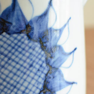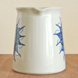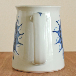 ![]() 素朴な草花をさりげなく活けても素敵♪ 水差しの形だから、お花が生き生きと見えてとても素敵です。重みがあるので、お花を活けても安定感があります。 ![]() 鉢植えに水をあげるときに使っても♪ ピッチャーとしてもお洒落ですが、実際に注ぐと後引きしやすい作りですので、お鍋の際にスープを注いだりなどはおすすめできません。 どちらかというと水差しとしての実用性よりも手付きの筒鉢としての使い方をおすすめします。キッチンに置いて菜箸やおまたなどを立てて使ってもお洒落です♪ ![]() しっかりと握ることができる大きめの持ち手。 ![]() 砥部焼らしい厚手のなめらかな白磁。砥部焼の白磁は真っ白ではなく、ほんのり青味掛かったあたたかみがあります。 ![]() 藍色の濃淡は、いかにも手描きらしい味わい。 ![]() ひとつひとつ手づくり手描きらしい違いがあります。 ![]() はがきと比べて。 |
