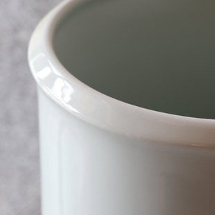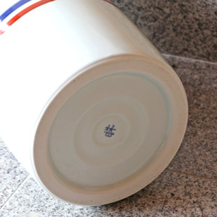 ![]() 大きめで安定感ある円柱型のどっしりとした傘立て。玄関を守ってくれるような存在感です。 ![]() なめらかな白磁に映える藍と赤のコントラストが美しい「みつ葉」の絵付け。 傘立て高さは43.5cmくらい。深さは41.5cmくらいです。 ![]() 口径の外寸は23.5cm、内寸は20.5cmくらいと広めに作られています。 ![]() 底の直径は21cmくらいです。梅山窯さんの「梅」の窯印。 |