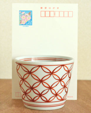 ![]() 厚手のなめらかな白磁のそばちょこ。赤の絵付が白磁によく映える印象的な絵付け。手間の掛かる絵付けだからこその美しさがあります。 ![]() 高さは7cmくらい。そばちょこの深さは6cmくらいです。 連続した文様がそばちょこを彩ります。熟練の技を感じる絵柄です。絶妙なバランスです。 ![]() 口径は8.5cmくらいです。ほんのり青味掛かった白磁。 そばちょこの中は、縁の近くに2本の赤いラインが引かれています。 ![]() 底の直径は5.5cmくらいです。 ![]() 底には梅山窯さんの「梅」の窯印。梅山窯さんの「そばちょこ」は、テーブルに当たる部分に釉薬(ゆうやく)が掛かっているのでつるりとしています。 ![]() そばちょこひとつひとつ、手描きらしい微妙な違いがあります。 ![]() はがきと比べて。 |