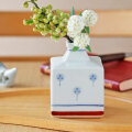 ![]() 1辺が6cmのキューブ上のかたちをした可愛らしい花器。 ![]() たんぽぽをモチーフしたほっこりとする文様。下の部分に赤い帯を入れることによって、藍の染付がより柔らかな印象となっています。 ![]() 面ごとに唐草の文様が描かれています。 ![]() 花を入れる部分も四角形となっています。 ![]() 実際の花を活ける部分の内口径は1.5cm×1.5cmくらいです。 ![]() フラットな底も6cm×6cmの正方形。底には梅山窯さんの「梅」の文字。 ![]() これくらいの大きさ。片手に乗るくらいのサイズです。 |