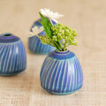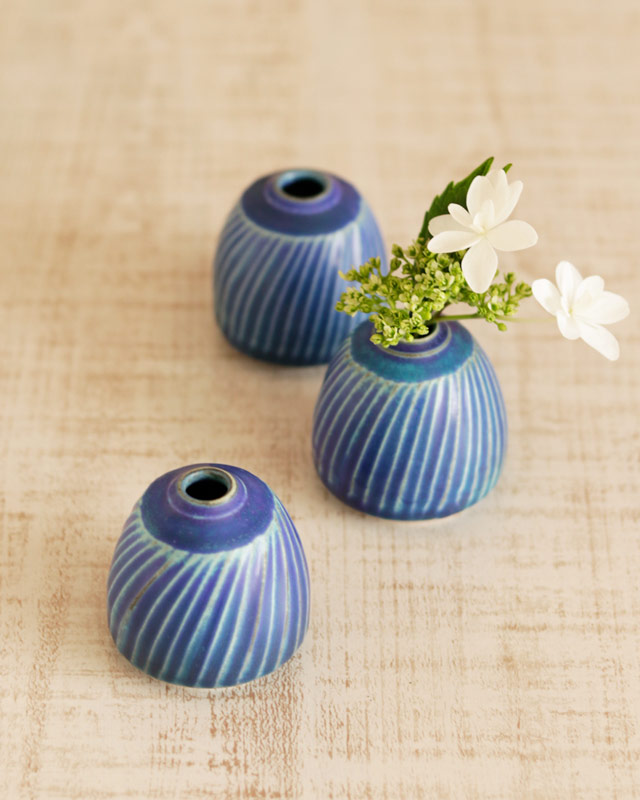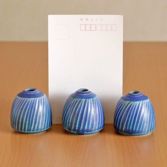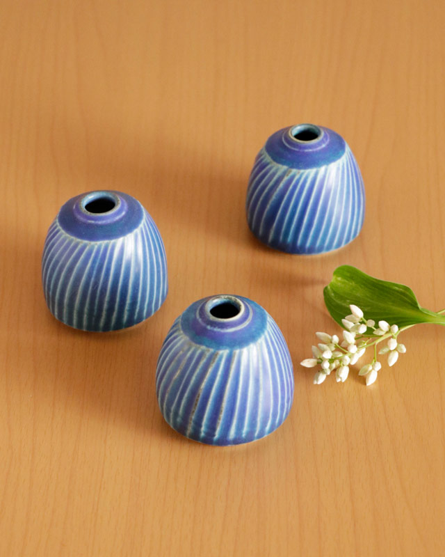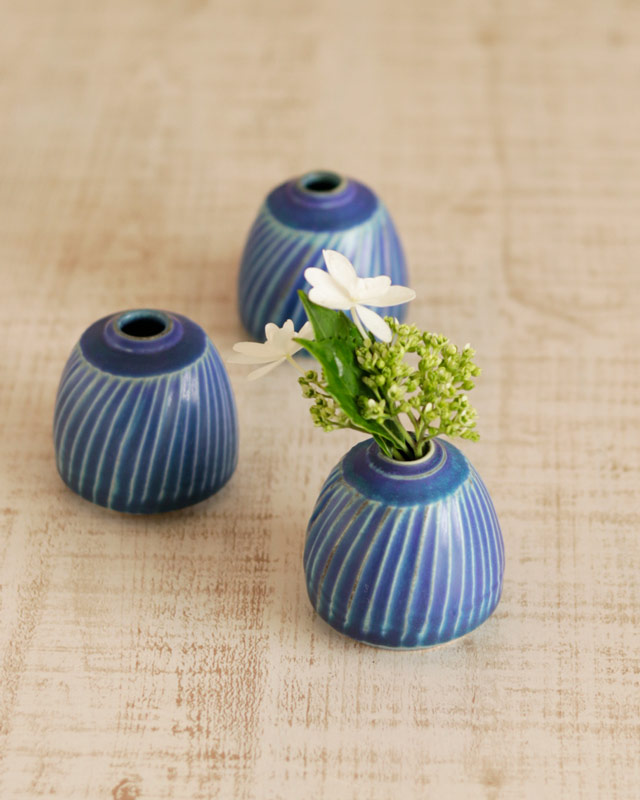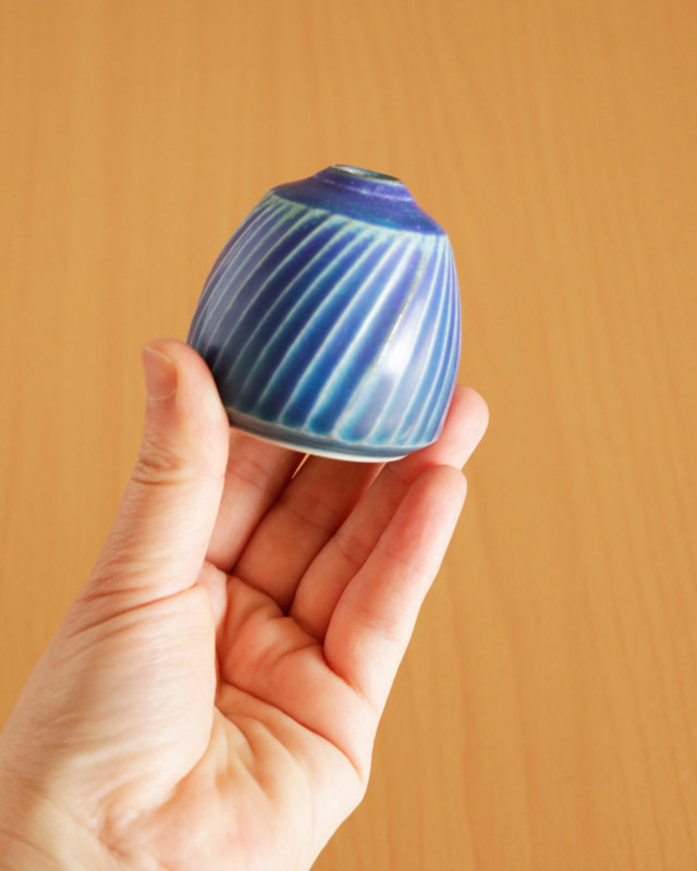 なんともいえない美しいブルーの色が印象的な小さな花器。