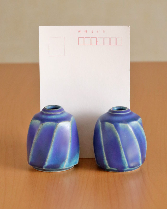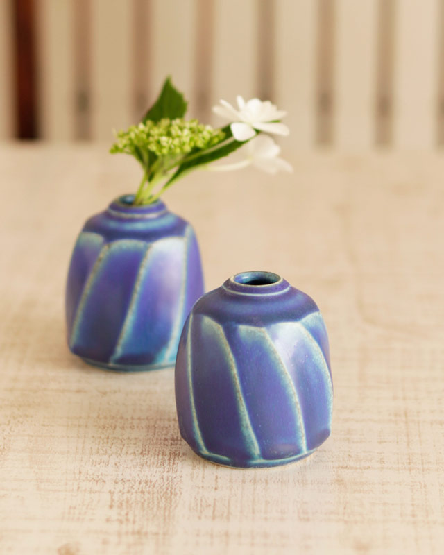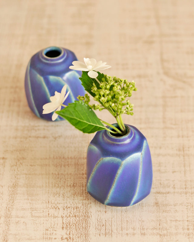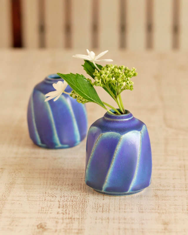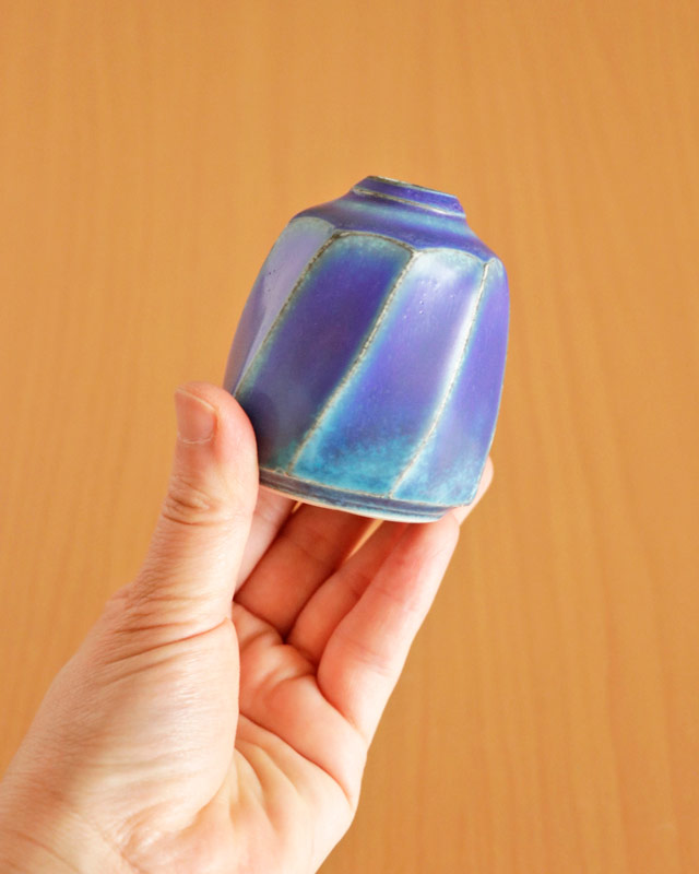 なんともいえない美しいブルーの色が印象的な小さな花器。