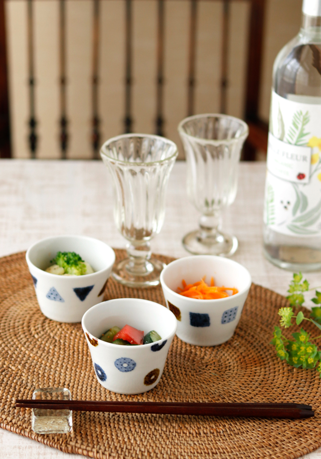 ![]() 艶を少し抑えた白磁に、手仕事らしい絵付けが素敵な蕎麦猪口。素朴さのなかにお洒落さも感じる「イロリ工房」崎村彩香さんの丁寧な手仕事の作品。 ![]() 高さ5cmくらい。小さめの蕎麦猪口となります。 ![]() 直径は約7.5cmくらい。 ![]() 底の直径は5cmくらい。 ![]() ![]() 3個重ねると8cm~8.5cmくらいの高さです。 ![]() 絵付けの濃さや色合い、大きさなど、ひとつひとつ手づくりらしい違いがあります。 ![]() 同じ絵柄で「まる紋のそばちょこ(大)」もございます。大サイズも蕎麦猪口としては少し小さめですが、小サイズはさらに小さなサイズとなります。 |
