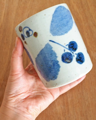 ![]() 土が混ざった素朴な風合いの砥部焼と木製の蓋との組み合わせが、お洒落なキャニスター。木の葉をモチーフにした雰囲気ある絵付けが素敵。 ![]() 適量で450ccくらい入るサイズです。 ![]() ゴムのパッキンが付いていますので、蓋を閉めた際に密封性があります。 ![]() 蓋を閉めた高さは11.7cmくらい。本体のみの高さは11cmくらいです。 ![]() 直径は9.5cmくらい。内寸の直径9cmくらいです。 ![]() 高台の直径は8.5cmくらい。 ![]() ひとつひとつ手づくり手描きらしい違いがあります。 | ![]() そのまま置いても素敵なキャニスターだから、いつも使っているコーヒー豆や紅茶などを飾りながら収納できます。 お茶の時間、お菓子を入れても♪ ![]() 絵柄違いで砂や塩を入れても便利。 「ブルー木の葉」以外に「ガーベラ」「花文」「水玉」「小花」と全部で5柄ありますので、絵柄違いで揃えても楽しいですよ。 ![]() 素朴な素地によく似合う、気取りないあたたかみある絵付け。 こげ茶色の大小の鉄点が入ってより味わい深い雰囲気に。マット調の素地は柔らかなグレー掛かった色合いです。 ![]() 下の方に森陶房さんの窯印が押されています。 ![]() これくらいの大きさ。 ![]() はがきと比べて。 |