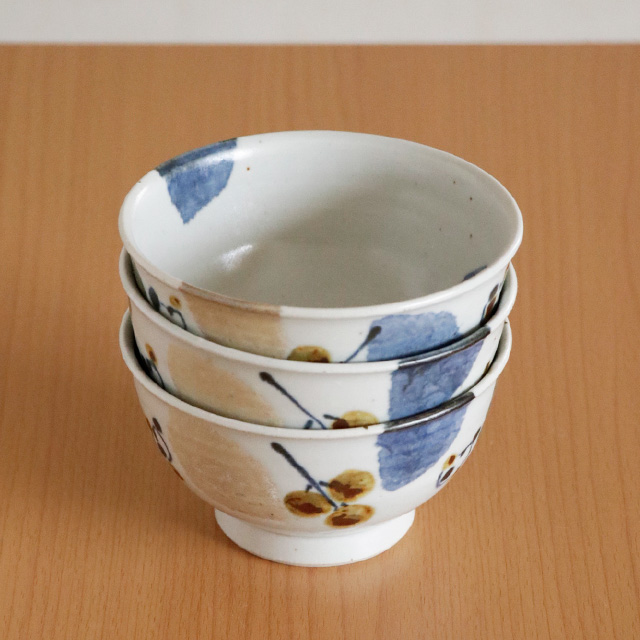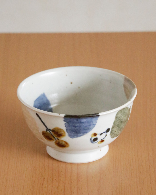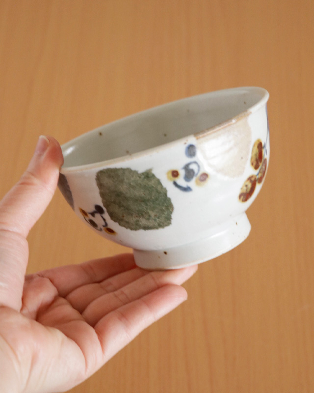 ![]() ほんのり生成り掛かったややマット調の素地に、大小の鉄点が入った丸みあるかたちの茶碗。 可愛らしさも感じながら手づくりらしい味わいも魅力です。 ![]() 高さは6.5cmくらい。 ![]() 藍の染付に鉄色と緑色を組み合わせて、木の葉をモチーフにした雰囲気ある絵付けが素敵。 ![]() 口径は11.5cmくらい。 ![]() 3個重ねると11cmくらいの高さ。 ![]() 茶碗ひとつひとつ手仕事らしい違いがあります。 |