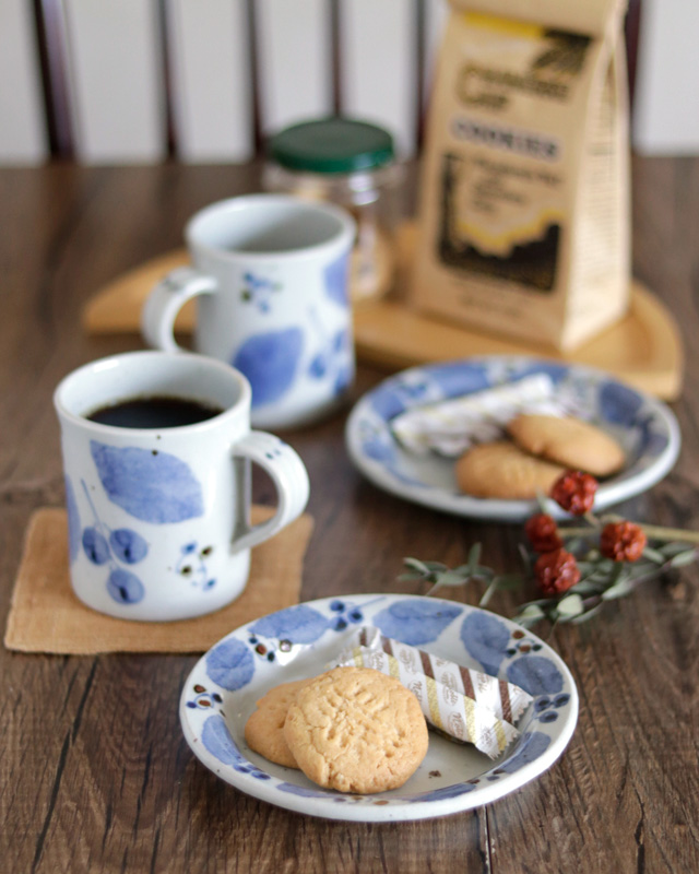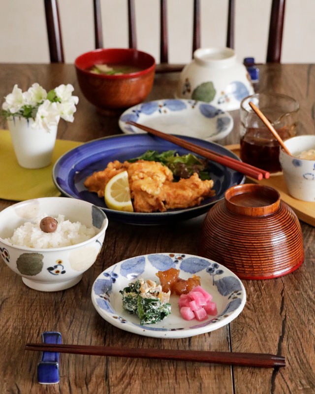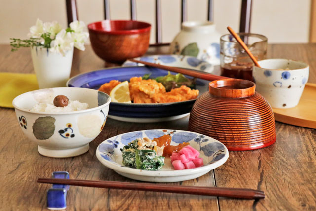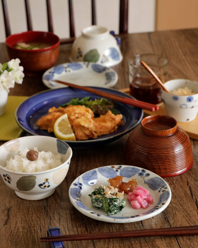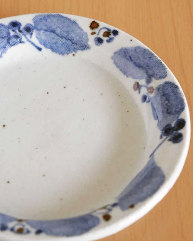 | 色・特徴 | ほんのりグレー掛かった布目調の素地。表面に大小の鉄点。 藍色・茶色・緑色の絵付け。 窯出し時期などによって多少の違いがございます |