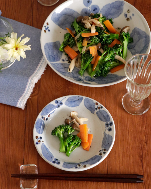 ![]() 取皿としても活躍するサイズです。主張しすぎない素朴な絵付けですので和洋中とあらゆる料理に♪ ![]() 平らな部分が広めですので数種類の前菜など盛ることができます♪ ![]() 菓子皿としても素敵。くつろぎのひとときにぴったり♪ ![]() 鉄点が入った素地は、さりげなく布目になっています。 「葉」の絵柄は和紙を透して染付されていますので、貼り絵のような雰囲気。淡い藍色の染付のなかに鉄色をつかって表現した小さな「実」がアクセントになっています。 ![]() お皿1枚1枚手仕事らしい違いがあります。 ![]() これくらいの大きさです。 |