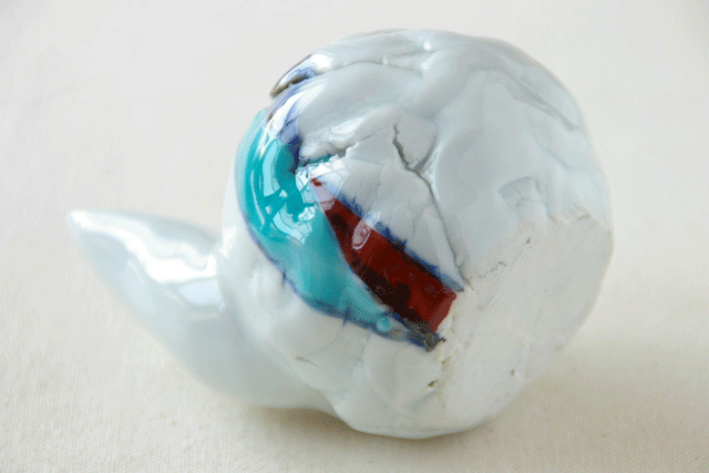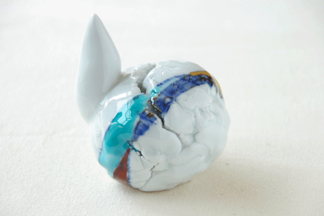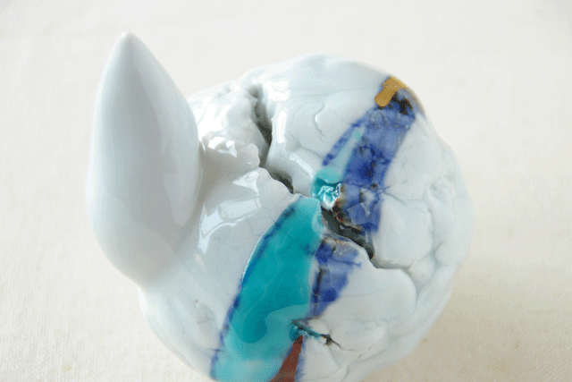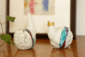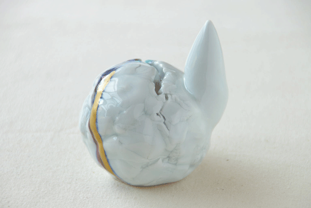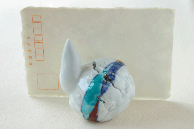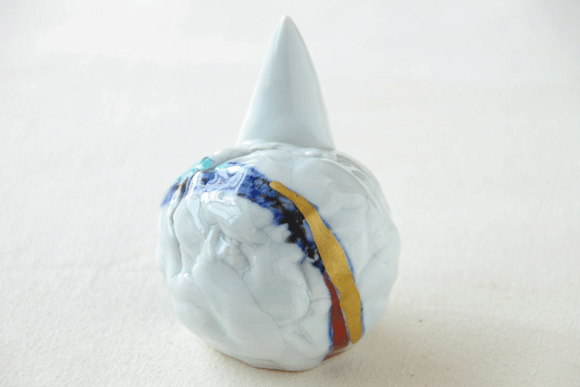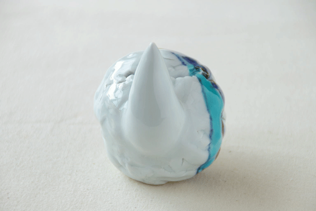 ![]() 手でギュッギュッとまあるいおにぎりを握るように作られた球体に、ツノのような円すいが付けられています。 ![]() 藍色・赤・緑に金彩の絵付けは西岡さん の世界。そのままオブジェとして飾っても 素敵。ちょっとしたプレゼントにしても 喜ばれます。 ![]() 色絵付けのなかに金彩がほどこされることにより、作品の品格を高めます。 ![]() 底面からみたところ。 |