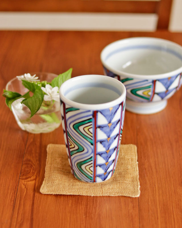 藍の染付に赤・緑・黄が加わった独特の文様が魅力です。