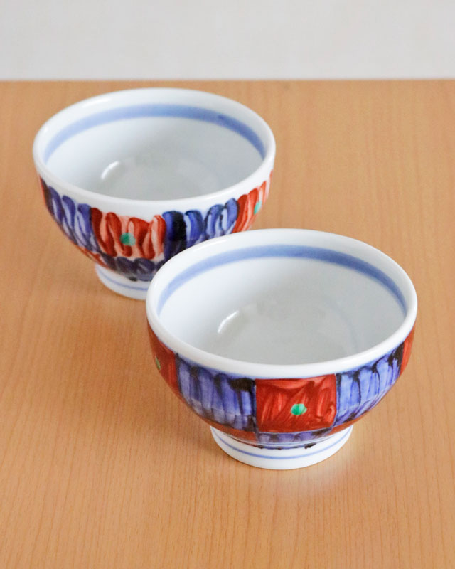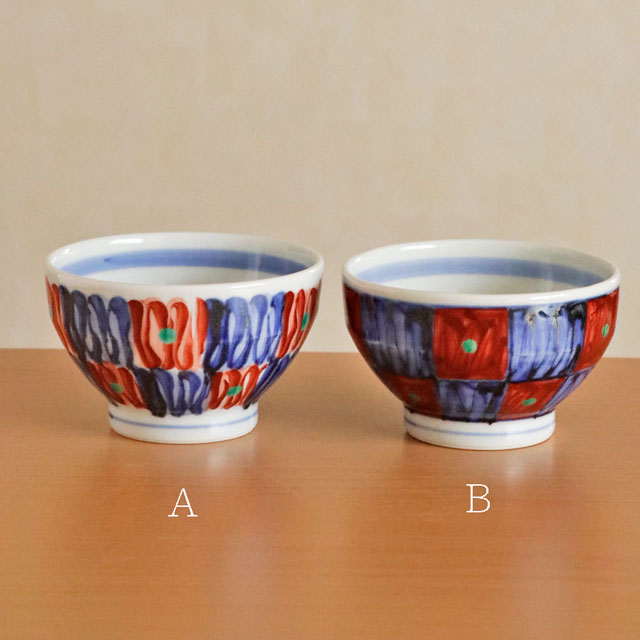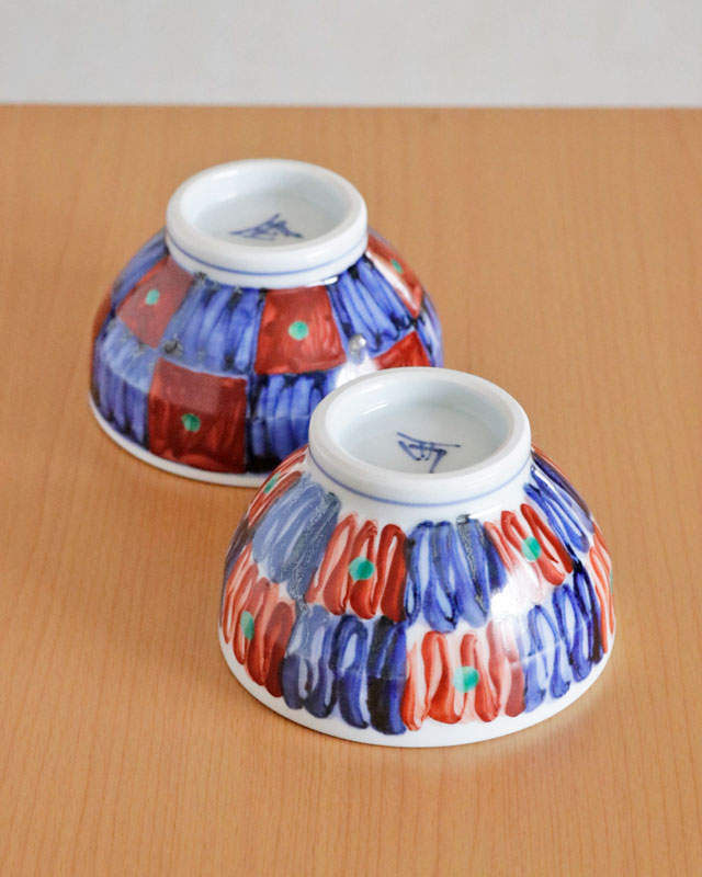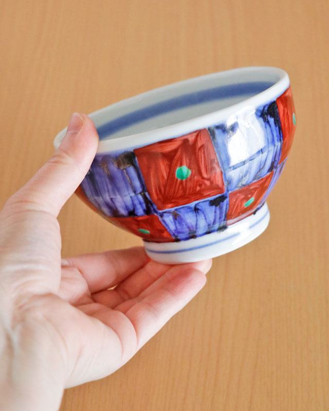 なめらかな白磁にひきたつ藍と赤の市松文様が印象的な茶碗。