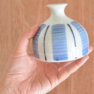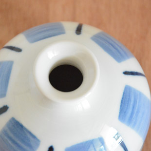![]() 安定感壺のような形が特徴の花器。玄関や窓辺や食卓など、気兼ねなく飾ることができるサイズです。 ![]() 花器の高さは8.5cmくらい。砥部焼らしい藍色の染付が、なめらかな白磁によく映えます。 少しの花でも様になる活けやすい形です。 ![]() ふっくらとした本体に小さな口が可愛らしい印象です。 ![]() 活け口の直径は3.5cmくらい。お花を活ける部分の口径は1.5cmくらいです。 ![]() 平らな底の直径はは9.5cmくらいです。 底には岡田陶房・岡田威さんの「威」の文字。 ![]() これくらいの大きさ。広げた手のひらに乗るくらいのサイズです。 |
