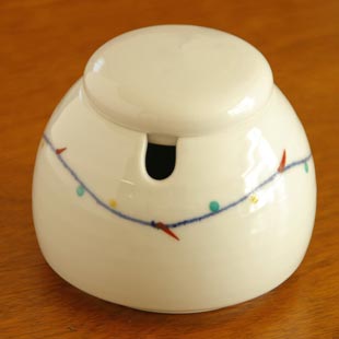 ![]() ころんとまあるい形。白磁に描かれた色絵付けが楽しくかわいい雰囲気。 ![]() スプーンを差し込むところも丁寧に作られています。くねくねとしたラインと色絵付けがポットをかこむ。 ![]() ふくらみある形なのでたっぷり砂糖が入ります。ふりかけを入れたり、佃煮を入れたりしてもいいですよ。 ![]() 底はこんな感じ。 |