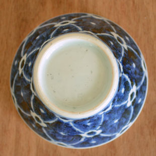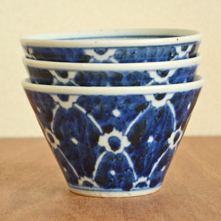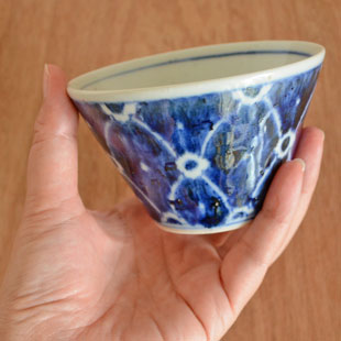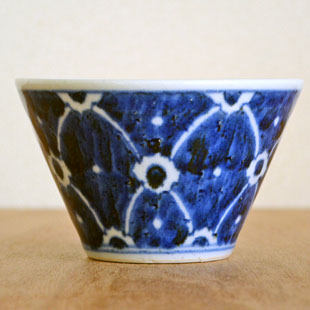![]() 直径10cmの円錐型の小鉢。鉄分を混ぜた素地を使っているので、表面に大小の鉄点が表れて味わいがあります。手描きらしい染付も魅力。 ![]() 藍の染付で文様を描くのではなく、白磁の部分を文様に。皐月窯さんらしいセンスを感じます。 縁に向かって広がった美しいかたち。 高さは6.5cmくらい、うつわの深さは5.7cmくらいです。 ![]() うつわのなかの縁近くにラインが引かれています。口径約10cmに対して底の直径は4cmくらいです。 ![]() 高台の直径は5cmくらい。 ![]() 皐月窯さんの「5」の窯印。 ![]() 絵付けの濃さや色合い・大きさなど、ひとつひとつ手づくりらしい違いがあります。 ![]() 3個重ねると9cmくらいの高さ。 |