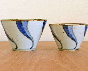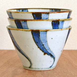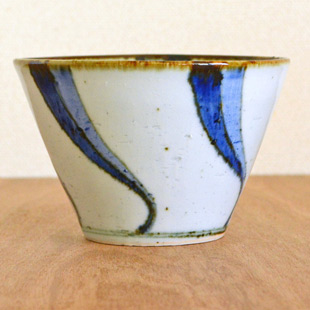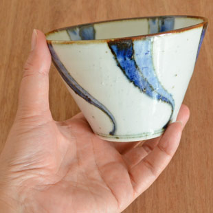 ![]() 直径12cmの円錐型の深みある鉢。鉄分を混ぜた素地を使っているので、表面に大小の鉄点が表れて味わいがあります。手描きらしい染付も魅力。 ![]() 藍の濃淡を活かした染付に皐月窯さんらしいセンスを感じます。縁に向かって広がった美しいかたち。高さは8cm弱くらい、うつわの深さは7cmくらいです。 ![]() 縁の部分は「縁紅」とよばれる鉄色となっているので味わい深い印象。うつわのなかにも流れるよう動きある「ねじり文」が描かれています。 口径約12cmに対して底の直径は4.5cmくらいです。 ![]() 高台の直径は6cmくらい。 ![]() 皐月窯さんの「5」の窯印。 ![]() 絵付けの濃さや色合い・大きさなど、ひとつひとつ手づくりらしい違いがあります。 ![]() 3個重ねると11cmくらいの高さ。 ![]() 同じ絵柄で直径10cmの小さめサイズ「ねじり文の小鉢(小)」(右)もあります。 |