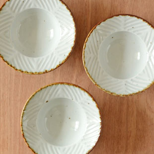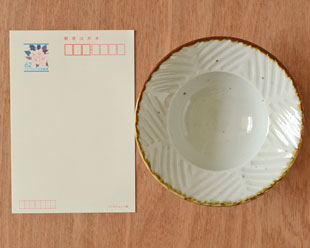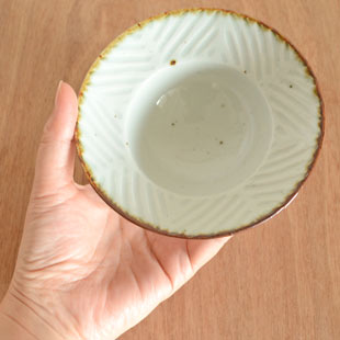 ![]() リムが付いたお洒落なかたちの小鉢だから惣菜をさっと盛ってもいつもと違ったイメージに♪少しの量を盛り付けても見映えよく引き立ててくれるかたちです。 漬物や煮物や酢の物などの普段の料理を気軽に素敵に演出してくれます。 ![]() 広めのリムが額縁のように料理を美味しそうにしてくれます♪その他にデザートのうつわとしても素敵です。 ![]() 大小の鉄点が浮き出た荒土の素地。荒土のため縁の部分がつぶつぶとしている場合もあります。 うつわの表面はほんのりマット調の落ち着きある光沢。素地と絵付けに合わせて釉薬にもこだわってつくられています。素朴な風合いに味わいあるしのぎのあとがとてもよく似合います。 ![]() これくらいの大きさ。 ![]() はがきと比べて。 |