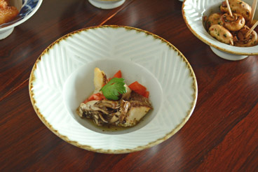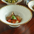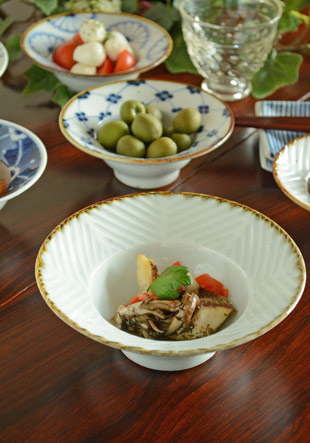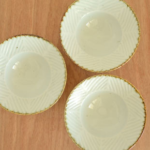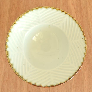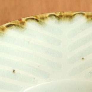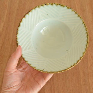 ![]() リムが付いたお洒落なかたちの小鉢だから惣菜をさっと盛ってもいつもと違ったイメージに♪少しの量を盛り付けても見映えよく引き立ててくれるかたちです。 漬物や煮物や酢の物などの普段の料理を気軽に素敵に演出してくれます。 ![]() ひとり分の揚げ物を盛っても楽しい♪広めのリムが額縁のように料理を美味しそうにしてくれます。 その他にデザートのうつわとしても素敵です。 ![]() 大小の鉄点が浮き出た荒土の素地。荒土のため縁の部分がつぶつぶとしている場合もあります。 うつわの表面はほんのりマット調の落ち着きある光沢。素地と絵付けに合わせて釉薬にもこだわってつくられています。素朴な風合いに味わいあるしのぎのあとがとてもよく似合います。 ![]() これくらいの大きさ。 ![]() はがきと比べて。 |