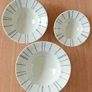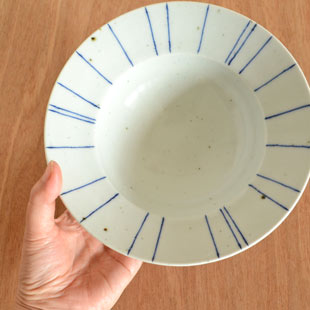 ![]() ちょっと少なめのパスタを盛っても素敵。 リムが付いたお洒落なかたちの小鉢だから惣菜をさっと盛ってもいつもと違ったイメージに♪ひとり分のサラダや煮物、シチューなど、普段の料理を気軽に素敵に演出してくれます。 ![]() 広めのリムが額縁のように料理を美味しそうしてくれます♪少しの量を盛り付けても見映えよく引き立ててくれるかたちです。 ![]() 大小の鉄点が浮き出た荒土の素地。荒土のため縁の部分がつぶつぶとしている場合もあります。藍色のラインは素地に線を掘ったあとに呉須の絵付けをするというとても手間暇掛かる手法で描かれています。 うつわの表面はほんのりマット調の落ち着きある光沢。素地と絵付けに合わせて釉薬にもこだわってつくられています。素朴な風合いに味わいある手描きの染付がとてもよく似合います。 ![]() これくらいの大きさ。 ![]() はがきと比べて。 ![]() 4寸(直径13cm)・5寸(直径16cm)・6寸(直径19.5cm)の比較。 |